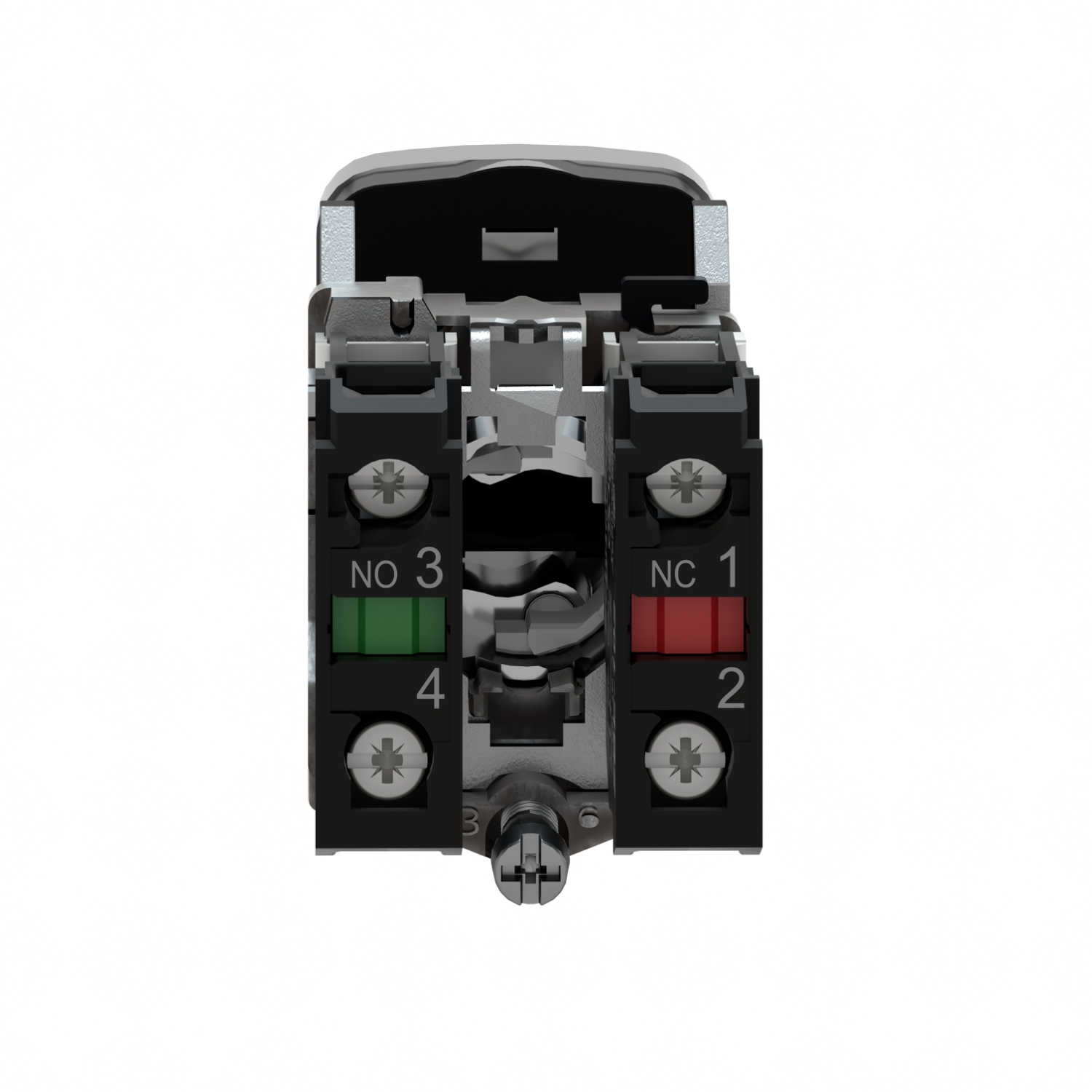 XB4BL73415 | Double-headed push button, metal, Ø22, 1 green flush marked I + 1 red projecting marked O, 1 NO + 1 NC